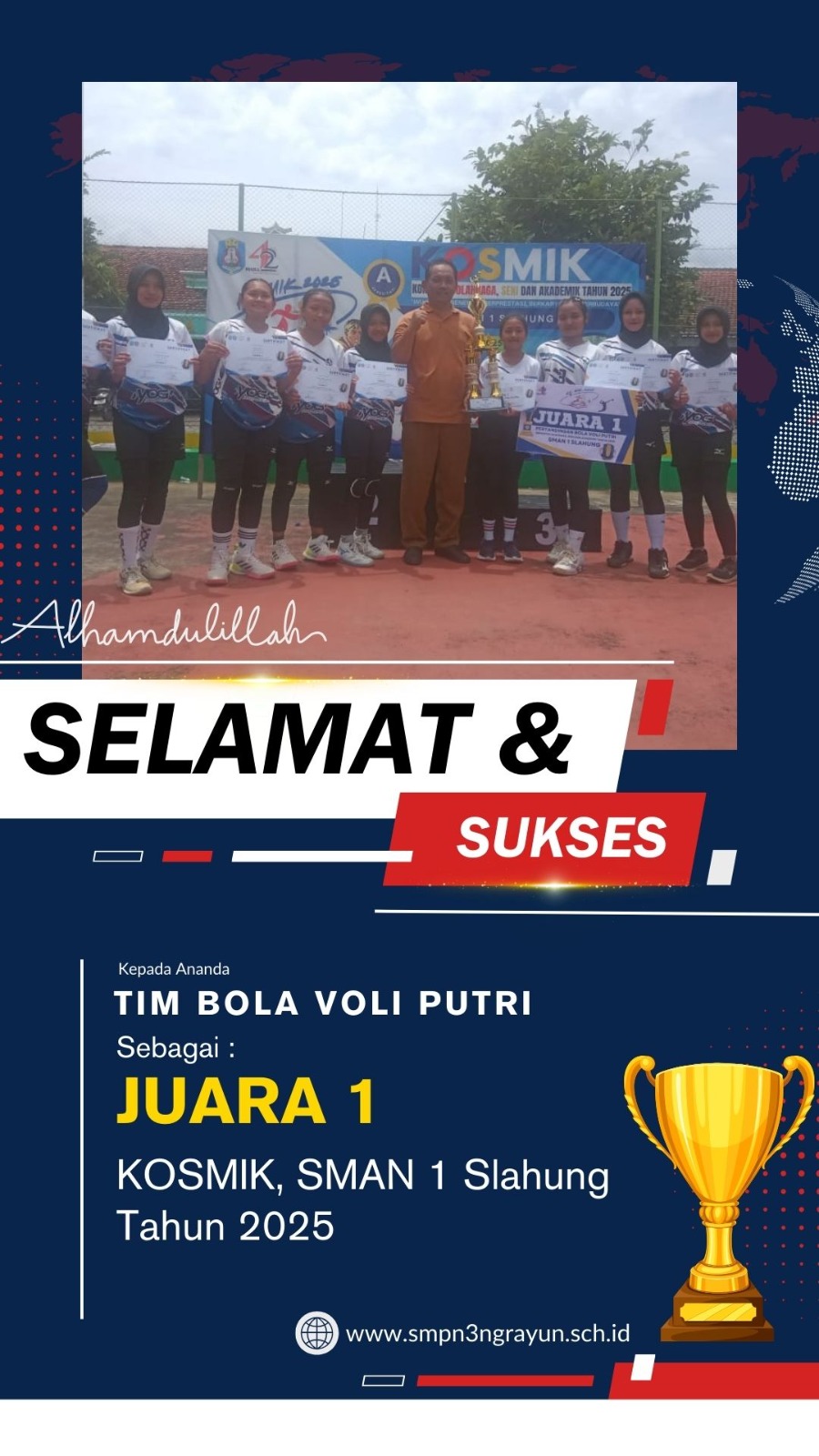 Ngrayun, 11 Agustus 2025 – Prestasi membanggakan kembali ditorehkan oleh SMP Negeri 3 Ngrayun. Tim bola voli putra dan putri sekolah ini sukses menyabet Juara 1 dalam ajang Turnamen Bola Voli antar Pelajar SMP/MTs Negeri dan Swasta Tingkat Kecamatan Ngrayun yang digelar pada 7 sampai dengan 11 Agustus 2025. Dalam pertandingan yang berlangsung di Lapangan…
